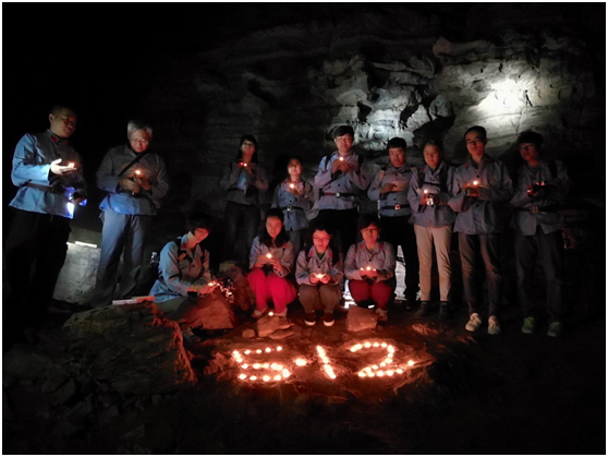 正值5.12汶川地震十周年紀念日,黨員們特意舉行了一個紀念祈福的儀式:在黑暗的洞穴中,大家手捧一支小小的紅蠟,圍繞著地上擺成“5.12”的字樣燭光,為地震遇難同胞默哀祈福。此后,大家熄滅蠟燭,在黑暗靜謐中,聆聽大自然的祥和,聆聽自己的心聲,給自己一個自省的時間。