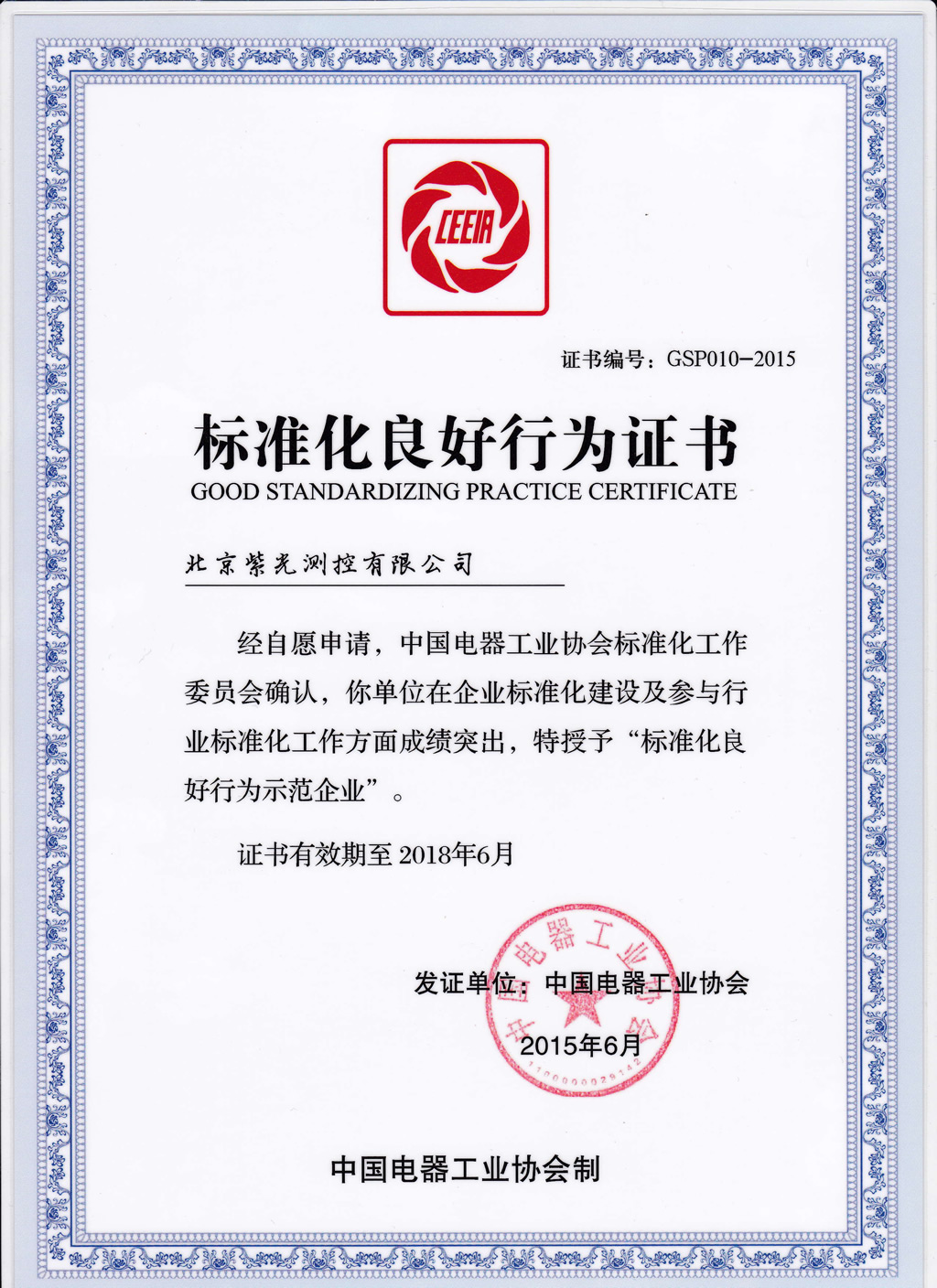 2015年6月4-5日在北京召開的2015年中國電器工業(yè)協(xié)會標準化工作會議暨中國電器工業(yè)協(xié)會標準化工作委員會二屆六次大會上,我公司被評為“電器工業(yè)標準化良好行為示范企業(yè)”。該項評比活動是中國電器工業(yè)協(xié)會首批開展的在電工領(lǐng)域營造企業(yè)貫徹標準和支持行業(yè)標準化工作的評價活動。經(jīng)行業(yè)推薦,協(xié)標委秘書處組織專家評審和公示,我公司為獲評企業(yè)并榮獲中國電器工業(yè)協(xié)會頒發(fā)的獎牌和證書。公司一直以來積極參與行業(yè)標準化工作,建立健全本企業(yè)標準體系,充分發(fā)揮標準的標桿作用,提升企業(yè)的標準化管理水平,使企業(yè)取得良好的經(jīng)濟和社會效益。